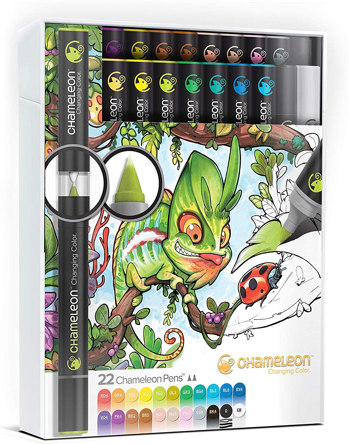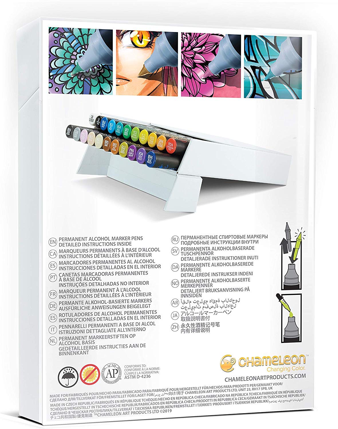 Details: Changing the way you think about marker pens. Chameleon color tones bring color control and simplicity to your art. Create stunning effects such as 3d, smooth transitions, highlighting, shading, graduations and blending, all with one Pen. Each Pen goes from light as a hint of a tint to rich tones, eliminating tonal gaps in your collection. Professional quality alcohol-based ink, refillable, replaceable super soft Japanese nibs, double-ended, permanent on most surfaces, compatible with all other alcohol-based inks, non-toxic and low odor, ideal for all paper crafts, manga, graphic and fine art. 22 pens in an individual pack (deluxe set - includes detail Pen and colorless blender Pen).