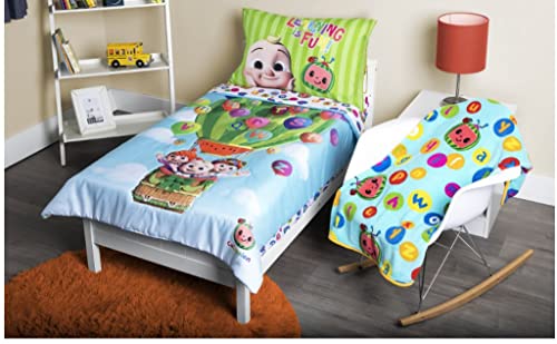 Details: Cocomelon 4 pc Toddler Bed Set with Bonus Blanket. Inspire dreams of cheer and playful adventures for your little one with this colorful and cozy Cocomelon "Learning is Fun" 4-piece toddler bedding set featuring the popular characters from the beloved preschool Youtube series. The neutral and colorful design featuring the beloved J.J. and his fun animal friends that love learning, music and adventure are sure to excite your child and make a versatile addition to any bedroom decor. This playful 4-piece set includes a bedspread and standard size pillow case as well as a flat and fitted sheet. Fits a standard crib/toddler mattress. The comforter and pillowcase is reversible so you can flip them over and reveal a different fun design. Crafted for comfort, this bedding is made from high quality, super soft Polyester. This bedding set is machine washable and designed to last without worrying about the color fading, making it a great choice for any child's room.