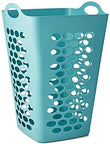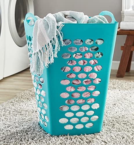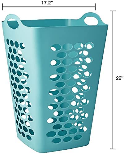 Details: Description The Mainstays Flexible Square Teal Laundry Hamper makes laundry day easy. Designed with two sturdy handles to make carrying even heavy loads a snap, the hamper features ventilation holes that allow light and air to pass through. This hamper can hold up to 2.2 bushels of clothing and has a lightweight polyethylene construction to make transporting clothing from your bedroom to your laundry room and back simple. The Mainstays Flexible Square Teal Laundry Hamper is a great way to keep dirty clothes organized and off the floor with a delightful style that goes with almost any room decor.