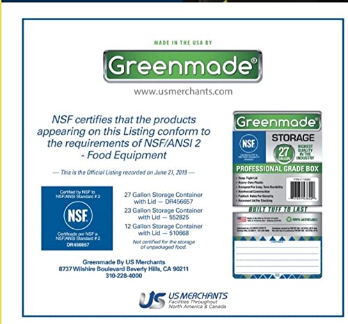 Details: Bring order to your utility closet, garage or spare room with the Greenmade storage tote. Simply snap the lid on, grab the convenient handles and stack the Greenmade 27-gallon storage tote with other boxes (sold separately) to keep everything neat and organized. Heavy-duty polypropylene construction promotes lasting use. Snap-on lid keeps your belongings securely enclosed. Black storage tote with a 27-gallon capacity accommodates sports gear, books, files, hunting essentials and other large items. Built-in handles promote comfortable carrying. Stackable design helps conserve storage space. Additional totes sold separately. NSF Certified: Conforms to the requirements of NSF /ANSI 2 - Food Equipment