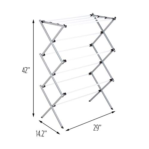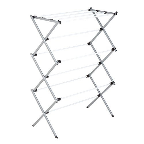 Details: Description Product Description Clean laundry is the name of your game. Now you can master more on your chore board with this Large Folding Drying Rack cleanly coated in white and silver. Its 24-linear feet of drying area provides easy ventilation for your all of your favorite garments or household items. Protect perfect pairs of blue jeans, delicate lingerie or vintage pieces from wear and tear of a dryer cycle—all while saving on energy costs. When you’re not using it, the rack neatly folds down to 3” flat for easy storage inside your laundry room, bedroom, or at your mom’s house. From the Manufacturer Who says a drying rack can't be beautiful and functional? Not the folks at Honey-Can-Do International. This sleek silver coated steel drying rack provides an attractive addition to your laundry room. Save on energy while protecting the environment by air-drying your clothes. Backed by a limited lifetime warranty, this unit offers 24 linear-Feet of drying space and folds flat for easy storage.