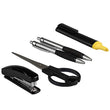 - Supplies include set of paperclips and staples, mini stapler, eraser, post it notes, one pair of scissors, two pens, yellow highlighter, 6 inch ruler, and box cutter