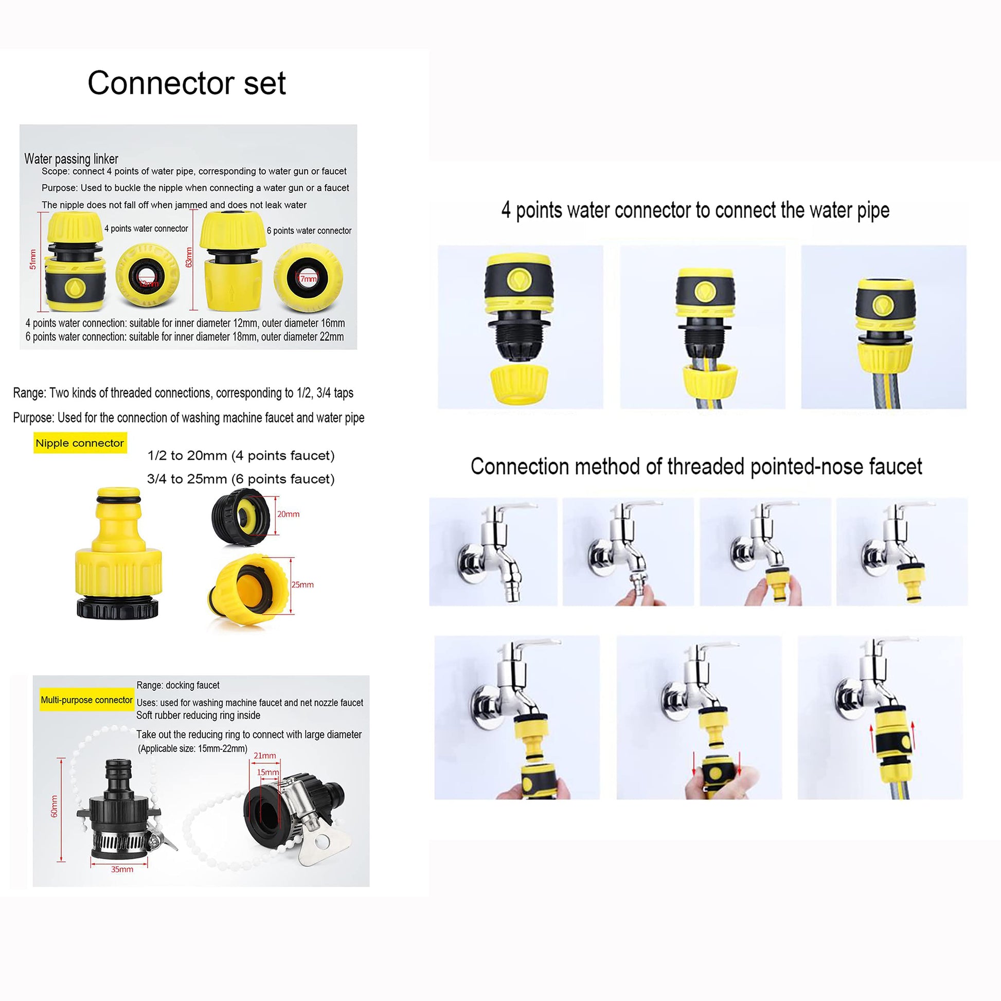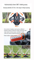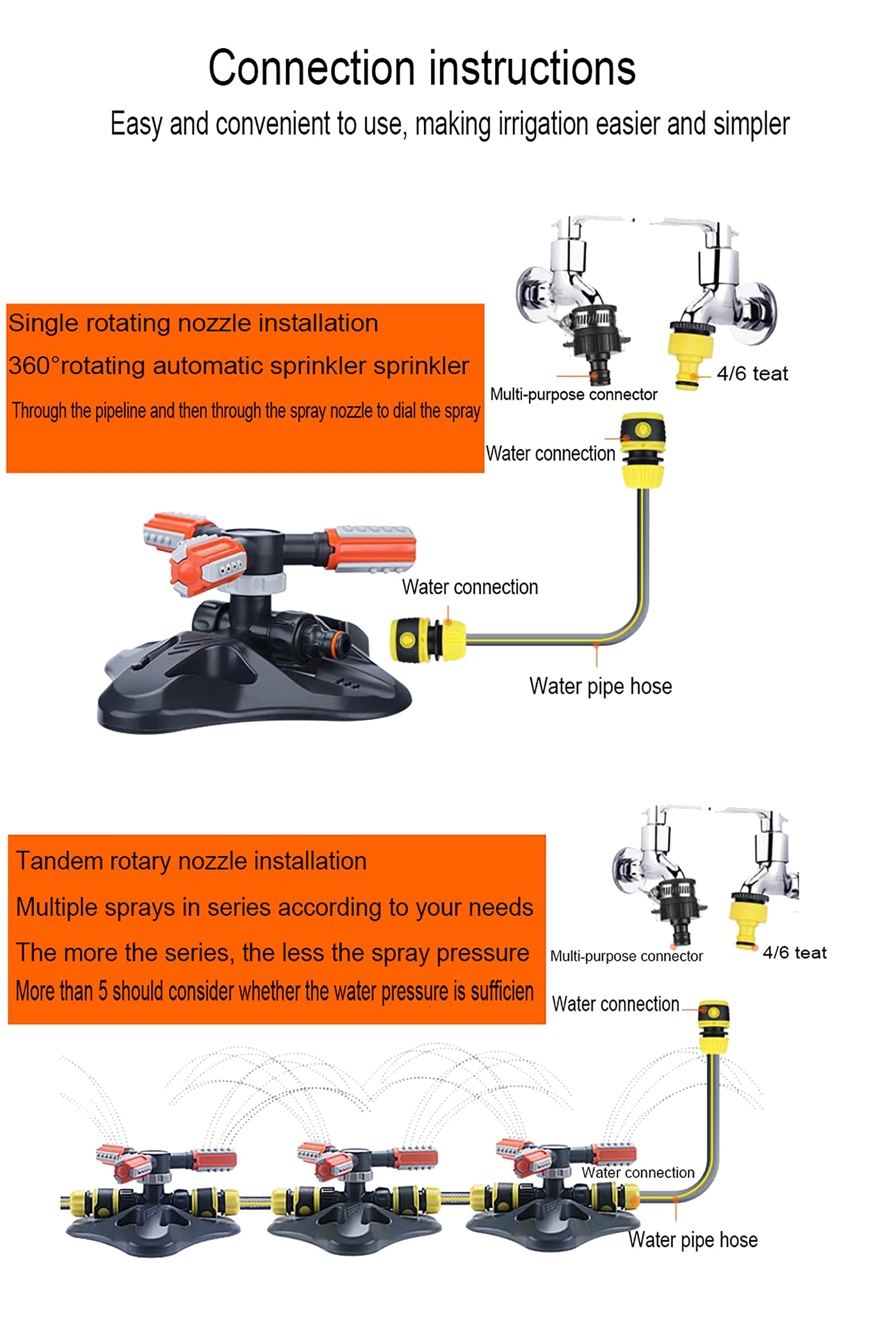 • Easy to use and quick to install: just connect the water joint to the connector and click. 360-degree rotating spraying, no other auxiliary power equipment is needed. Automatic garden/lawn irrigation can be realized only by the pressure of the household water supply.