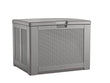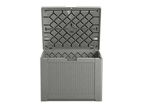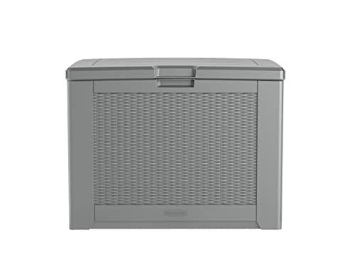 Details: Description Rubbermaid's Medium Deck Box features a basket weave pattern to complement decor. This deck box has 69% fewer parts and is much faster and easier to assemble then previous Rubbermaid medium deck box models. Safely store a variety of outdoor supplies including large patio cushions, patio umbrellas, charcoal, firewood, gardening equipment and more. This deck box is made out of heavy-duty resin that will not rust, rot, fade or warp.