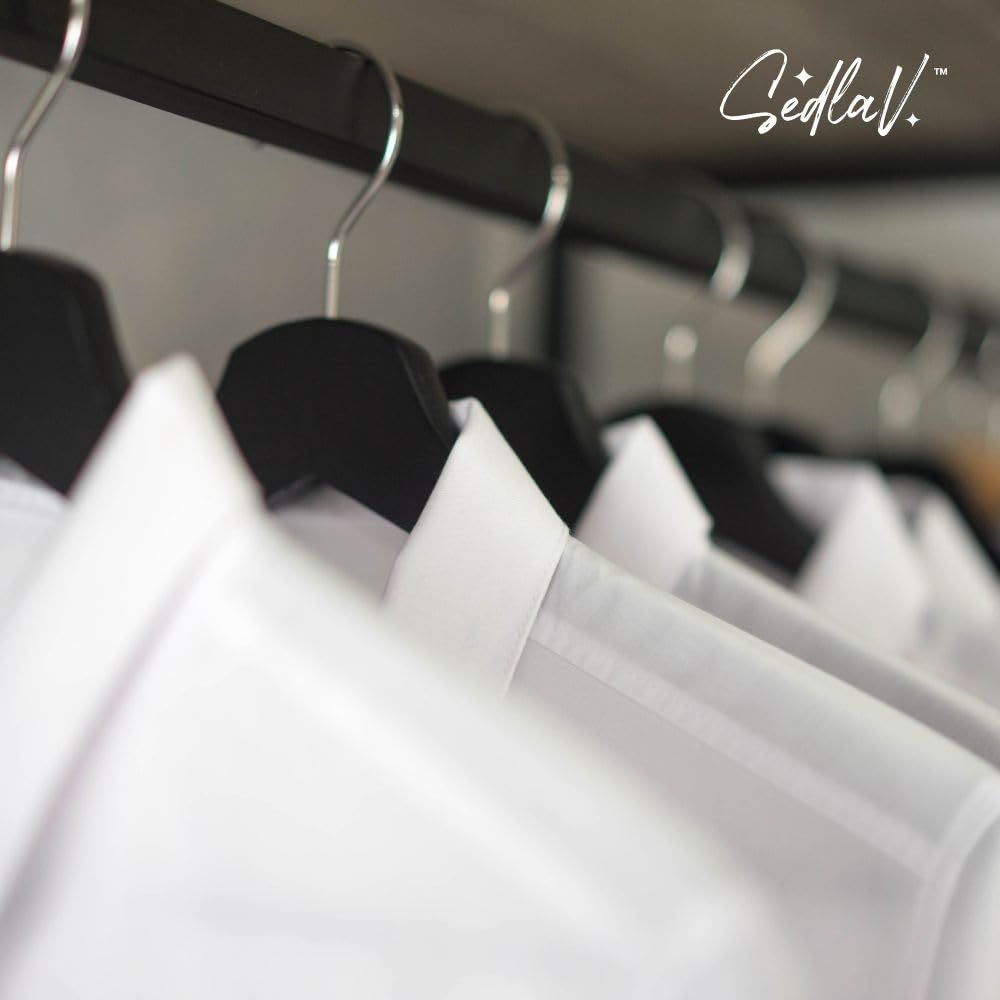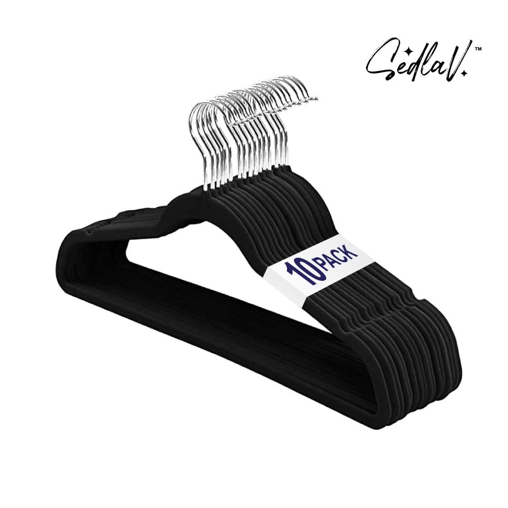 Introducing SEDLAV Premium Velvet Hangers, the sleek and stylish solution to your closet organization needs. This set of non-slip black velvet hangers, are designed to maximize space while keeping your garments secure and wrinkle-free. The ultra-thin construction is sturdy enough to hold up to 10 pounds, making them great for suits, shirts, dresses, gowns, blouses, and more.