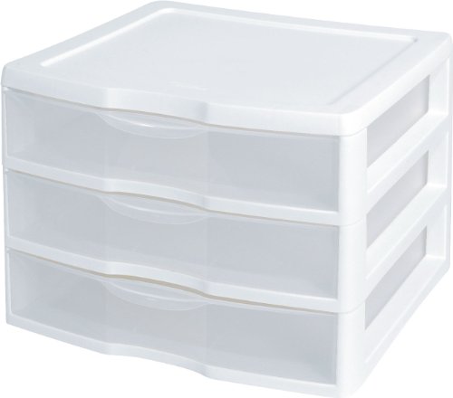 Sterilite 20938003 Clear View Wide 3 Drawer Unit White Frame with See-Through Drawers 3-Pack. The Clear view drawer units provide clear fronts to easily identify contents and easily stack to create a multi-unit drawer system. Small drawers are great for cosmetics and crafts while larger drawers hold office and crafting supplies.