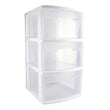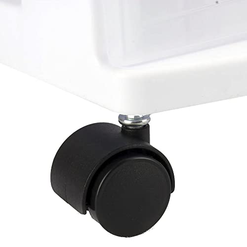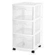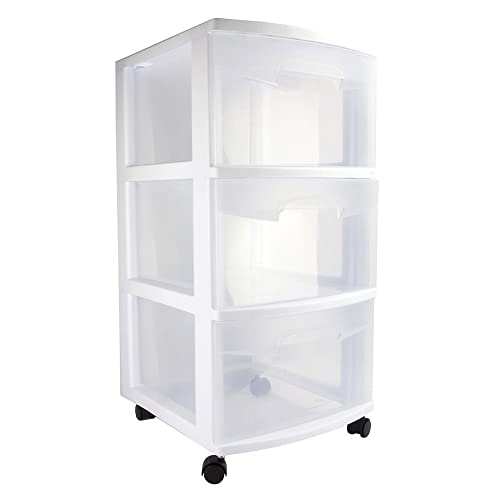Details: Description Keep all your items organized and easily accessible with the Sterilite 28308002 Home 3-Drawer Storage Container. Great for most homes, apartments, garages, or dorm rooms to get extra storage whenever and wherever needed. This portable storage container features 3 sturdy see-through drawers that allow for easy identification of contents. The design is ideal for use in the laundry room, closet, pantry, office, anywhere extra storage is needed. Casters are included to create a rolling storage option, giving you the option of a portable rolling drawer. Drawer carts can be used in a bathroom to quickly organize items such as towels, bath supplies, and more, keeping items easily accessible. This storage cart is made of durable plastic and can be cleaned with a damp cloth. Pull out the drawers and get your items with ease with the ergonomic handles. With dimensions of 15.25 inches in length, 21.8 inches in width, and 25.62 inches in height without the casters, you'll be able to store many items in this storage space. Keep your home neat and tidy with the Sterilite 28308002 Home 3-Drawer Wide Wheeled Plastic Storage Container.