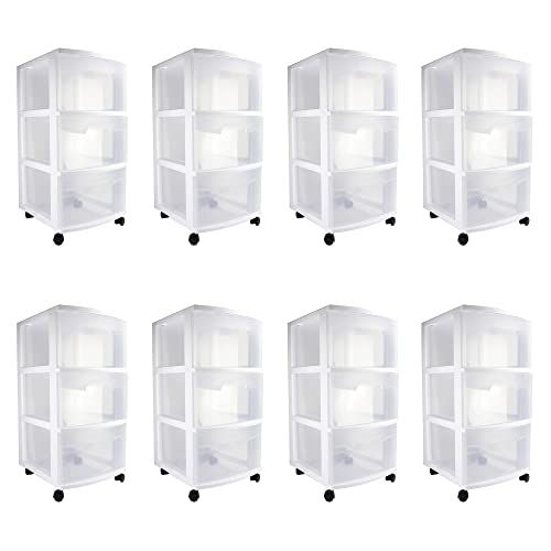 Sterilite 28308002 Home Stackable 3 Drawer Wide Plastic Storage Organizer Container with Drawers and Rolling Wheels, White (Set of 8)