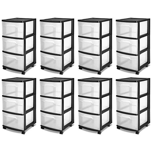 Sterilite 28309002 3 Drawer Multi Purpose Versatile Storage Cart with Clear Transparent Drawers, Ergonomic Handles, and Black Frame (8 Pack)