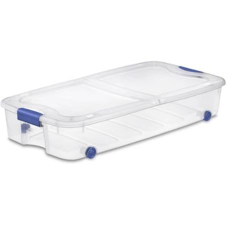 Details: Sterilite's Ultra Latch Storage Box line is ideal for those customers who want the ability to quickly identify contents yet need a durable storage solution. The innovative latch design secures the lid to the base while providing a rugged and comfortable grip surface. The recessed lids allow same size storage boxes to stack neatly on top of each other to use vertical storage space efficiently. The size and shape of the 66 Qt Latch Box allow it to fit conveniently under the bed to maximize unused storage space, ideal for clothing, linens, and shoes, with smooth gliding wheels to easily slide it into place. The hinging lid allows access to stored contents, without having to remove the whole lid. The overall assembled dimensions of this item are 39 1/2" L x 20 1/4" W x 7" H.