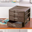 Details: Control everyday clutter and keep desks, countertops, and shelves clear and organized with Sterilite Countertop Drawers! The Sterilite Medium Weave 3 Drawer Unit is the ideal decorative solution for visible storage needs, for use in any room, for crafts, office supplies, jewelry, first aid supplies, beauty items, and more. The three opaque drawers conceal contents, while providing access to those items most frequently used. Easy pull handles allow drawers to open and close effortlessly, with a drawer stop to prevent drawers from being removed accidentally. The stylish weave pattern adds a fashion touch in easy to clean durable plastic. The overall assembled dimensions of this item are 13 1/2" D x 11" W x 10" H.