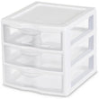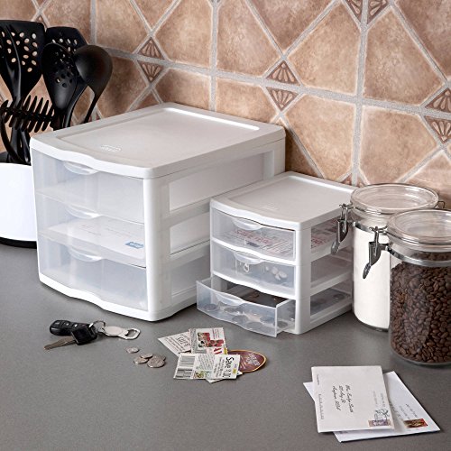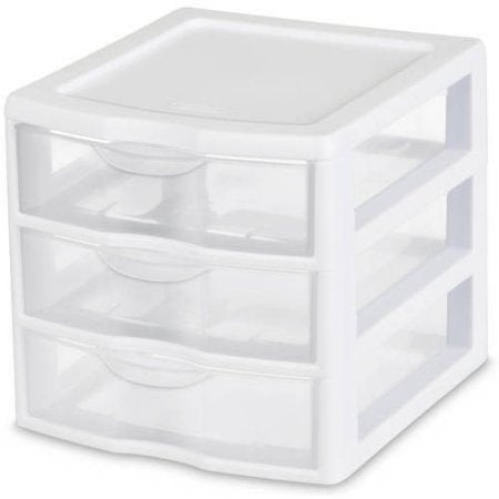 Details: Control everyday clutter and keep desks, countertops and shelves clear and organized with Sterilite countertop drawers, these multi-purpose storage solutions can be used in any room of the home, for crafts, office supplies, jewelry, first aid supplies, beauty items and more. The small three drawer unit features three clear drawers that neatly contain items but still allow contents to be easily identified . Ideal for keeping smaller items sorted and stored for easy access where they are used most often. The classic styling complements any decor. Multiple units can stack on top of each other to create customized storage solution.