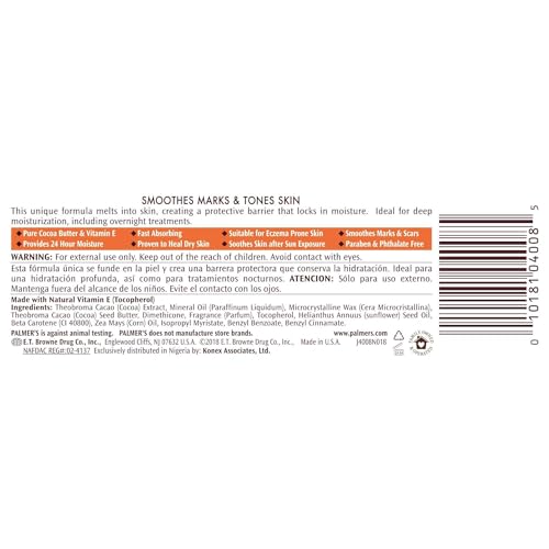 Details: Palmer's Cocoa Butter Formula Original Solid provides deep hydration all over. This unique formula melts into skin, creating a protective moisture barrier that locks in moisture. From normal to dry to eczema prone skin, this emollient rich solid effectively heals and softens, leaving skin smooth, supple and beautiful. Ideal for deep moisturization, including overnight treatments.