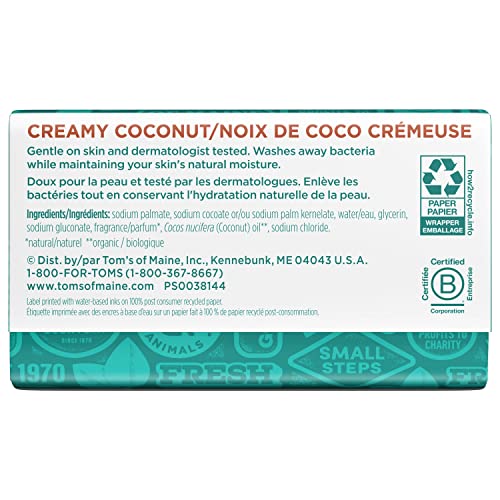 Details: Bring a gentle clean to your shower routine. Tom's of Maine Natural Beauty Bar Soap features organic botanicals like virgin coconut oil, raw shea butter or Moroccan argan oil, and the soap helps skin maintain its natural moisture. Breathe in the soothing fragrance of Creamy Coconut with every wash. At Tom's of Maine, we want to empower families to live more naturally. With more than 50 years experience combining scientific know-how, naturally derived ingredients and a bit of ingenuity, we make products that are good for you and the planet. As a Certified B Corp, we hold ourselves to the highest social and environmental standards. Plus, we're committed to supporting local communities for meaningful change, donating 10% of our profits to charities supporting health, education and the environment. We call this "doing good, for real," and it impacts everything we do.