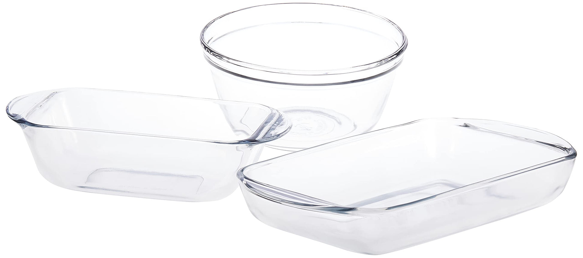 Details: Glass construction Each piece features 2 helper handles Ovenproof to 400 degrees Fahrenheit Perfect for baking, reheating, serving and storing The Anchor Hocking 11630 set will meet all basic baking needs. Perfect for baking, re-heating and storing and with all the Holidays coming up they'll come handy. It is a boxed set and would make for a perfect starters or gift set. Package Contents 2 Quart Bake Dish 8" x 11" 1.5 Quart Loaf Pan 5" x 9" 2.5 Quart Mixing Bowl 5 Ounce Measure Glass