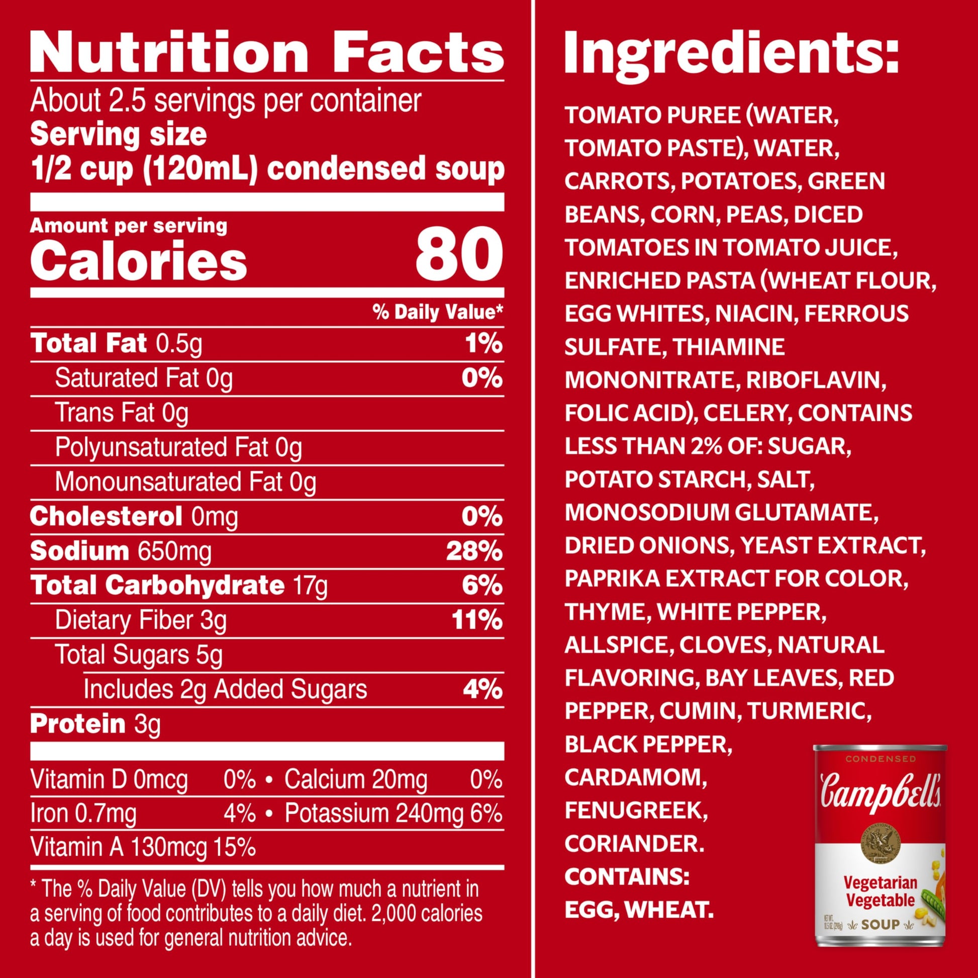 - PANTRY STAPLE: Each recyclable, non-BPA lined 10.5 ounce can of vegetable soup has 2.5 servings