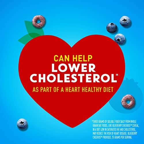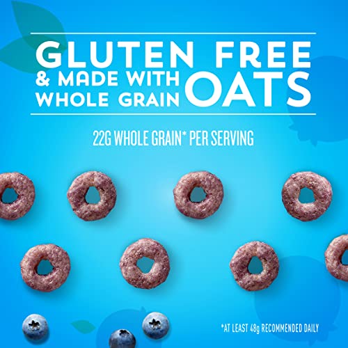 Details: Breakfast is berry good with Blueberry Cheerios Cereal. Real blueberry puree and other natural flavors help bring the delicious taste of blueberries to every bowl. Whole grain oats offer the wholesome goodness of Cheerios. Pass this blue box around the family table as part of breakfast. Offer the little blue Os as gluten free snacks for kids, or make blueberry cereal bars to share. Each tasty O is made with no artificial flavors or colors from artificial sources. Whole grain oats are the first ingredient in the gluten free cereal. Blueberry Cheerios cereal can help lower cholesterol as part of a heart healthy diet. Three grams of soluble fiber daily from whole grain oat foods in a diet low in saturated fat and cholesterol may reduce the risk of heart disease. Blueberry Cheerios provides 0.75 gram per serving. Store this whole grain cereal in your cupboard for heart healthy snacks or an easy gluten free breakfast food. This Large Size box contains about 11 servings. Whether youโre looking for kids snacks, trail mix ingredients or a heart healthy cereal the whole family likes, General Mills cereals spread goodness from tots to grown ups.