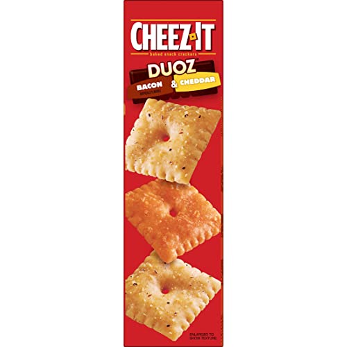 Details: Make snack time an occasion with the delicious taste of two awesomely bold Cheez-It flavors mixed together in one box. Each delicious handful of Cheez-It DUOZ Bacon & Cheddar Snack Crackers is packed with the taste of salty, savory bacon and made with 100% real cheese that's been perfectly aged for a full, bold flavor with every mouthful. Irresistibly crunchy and full of cheesy, bacony goodness, Cheez-It DUOZ Bacon & Cheddar Crackers are an ideal companion for lunchboxes, after school, late night snacking, or busy, on-the-go moments. Your taste buds will love the delicious combination of cheddar and smoky bacon flavor in every perfectly toasted handful of Cheez-It DUOZ Bacon & Cheddar Snack Crackers.