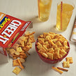 - A perfectly seasoned snack mix of white cheddar crackers, Cheez-It Original crackers, salty pretzels, mini toasted bread slices, and crunchy cheese curls