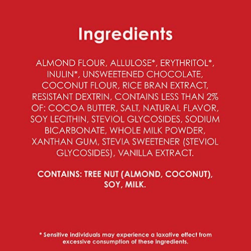 Details: 2 g net carbs (2 g net carbs per serving = 13 g total carbs - 5 g dietary fiber - 3 g erythritol - 3 g allulose) per serving. 0 g added sugar per serving. Gluten free. Keto friendly. Not a low calorie food. See nutrition information for calorie and sugar content. Soft and chewy. Sweet moments can be keto friendly. Now you can enjoy delicious chocolate chip cookies while keeping sugar and carbs in check. Made with almond and coconut flour, these cookies are gluten free with zero sugar added! www.duncanhines.com. how2recycle.info. Scan for more food information or call 1-800-362-9834. SmartLabel. Questions or comments, visit us at www.duncanhines.com or call 1-800-362-9834. For more delicious inspiration, go to: duncanhines.com.