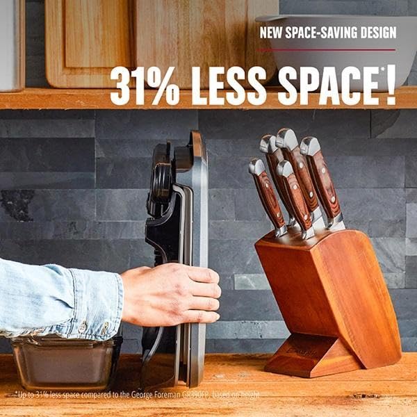 Details: Cook for the whole family without crowding the countertop! It’s easy with the new space-saving design on the George Foreman 9-Serving Classic Plate Electric Indoor Grill and Panini Press. With 120 sq. in. of cooking surface, you can grill tasty burgers, chicken, fish, Panini, vegetables, and more! The compact design takes up 31% less space, so you can store the grill in tight spots on the countertop or in the cupboard. Classic grill plates feature the Advanced George Tough nonstick coating, which is 3x more durable and free of PFOA. Plus, the adjustable cooking angle lets you tilt to remove excess fat during grilling, and set it flat for toasting Panini. This party-size electric indoor grill is a must-have for families who want fast, delicious meals. Up to 31% less space compared to the George Foreman GR390FP, based on height Compared to standard George Tough nonstick coating