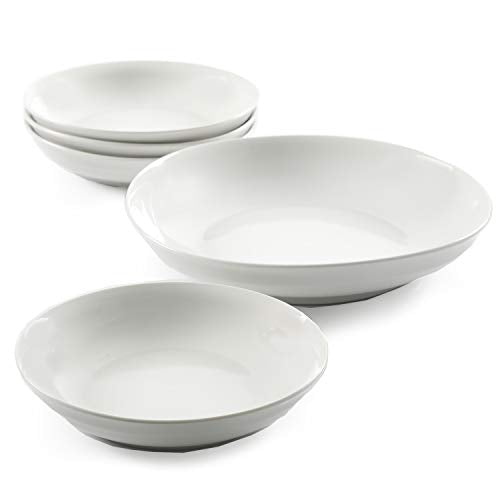 Details: Simple yet elegant, the Gibson Set of Four Pasta Bowls with an 11 inch Serving Bowl is a versatile and affordable choice for dinnerware. From parties and celebration, to a normal family dinner, these bowls will brighten your dining room table with a touch of sophistication. These bowls are expertly crafted of high-quality earthenware, fired at high temperatures for strength and durability. The ceramic material is then glazed, making it water tight and furnishing it with a smooth, attractive finish. Furnished in a bright white color, these bowls will beautifully showcase your food and make every meal look like delectable cuisine. The set includes service for four, each bowl furnishing an 8-inch size with one 11 inch serving bowl to offer sufficient space for pasta, salad, soup or a scrumptious dessert. They're dishwasher safe to make cleaning a breeze, and are strong enough to withstand microwave temperatures and frequent, daily use to ensure continual use year after year. Combining a smooth, polished look with sturdy construction, these bowls will create a beautiful table setting to set the tone for a delightful meal. Use this classic dinnerware for any occasion to produce an elegant setting that will delight your family and guests.