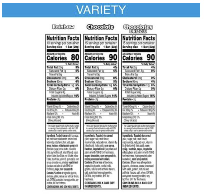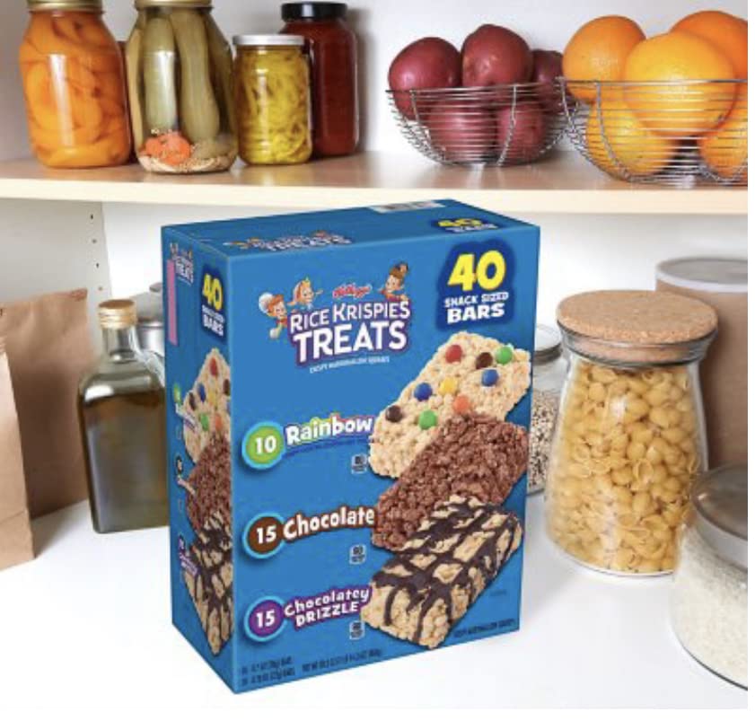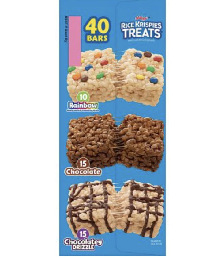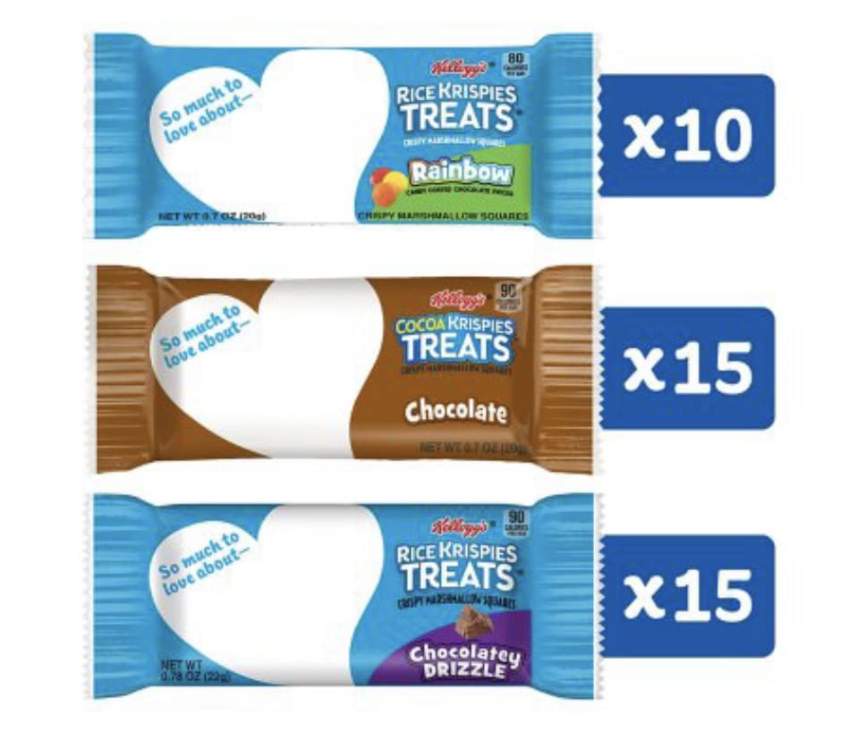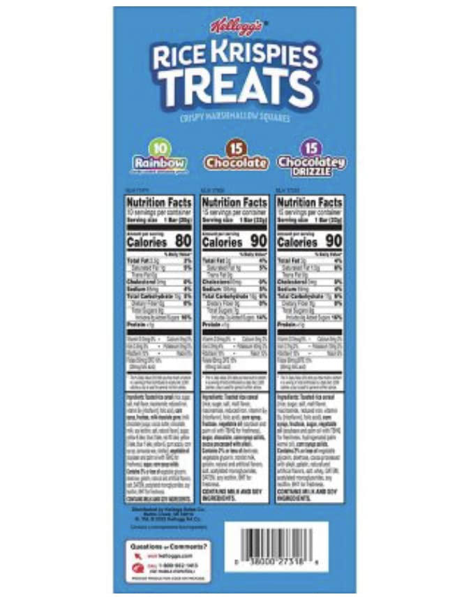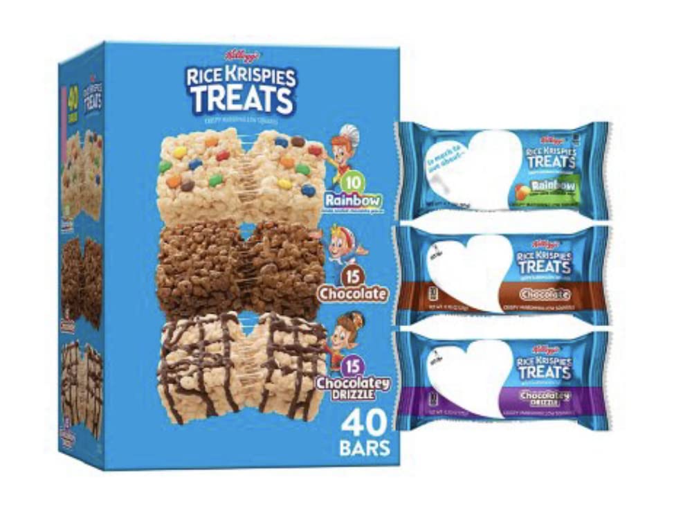 Details: Make snack time a little sweeter and more fun with Snap, Crackle, Pop, and the irresistible taste of Rice Krispies Treats Crispy Marshmallow Squares. Includes one 30.3-ounce box containing 40 Rice Krispies Treats in three flavors: Chocolate, Rainbow, and Chocolatey Drizzle. When it's time for a sweet snack, take your pick. Each square is made with puffed rice cereal and the taste of chewy, gooey marshmallows for a delicious, ready-to-eat treat wherever you take it. It's a tasty snack for any time of day. Each individually wrapped package contains one crispy marshmallow square that's perfect for snacks at school, the office, traveling, lunchtime, at the game and more.