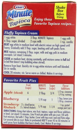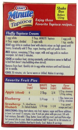 Kraft Minute Tapioca is made with tapioca. It cooks in minutes and makes a delicious pudding or pie filling