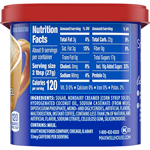 Details: Naturally & artificially flavored. 12 calories per 2 tbsp. 53 mg caffeine per serving. Make about 9 servings. maxwellhouse.com. Maxwell House International Vanilla Caramel Latte Cafe Style Beverage Mix has a consistent signature taste that is good to the last drop. This vanilla caramel latte coffee mix is exceptionally smooth and is the perfect way to treat yourself any time of day. This cafe style beverage mix features coffee mixed with vanilla and caramel flavors for a rich, creamy taste. Simply mix hot water or milk and this vanilla caramel flavored coffee mix without a brewer for instant indulgence. Maxwell House coffee drink mix is packaged in an 8.7 ounce resealable canister to help lock in flavor between uses. From lively light roasts to full bodied dark blends, Maxwell House signature taste is created through a process that isn't done the easy way, but the right way, for 125 years.
