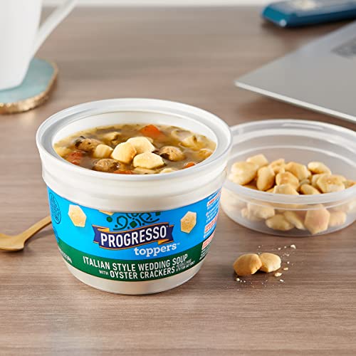 Details: Top off a delicious meal with Progresso Toppers Italian Style Wedding Soup. This single-serving of our delicious, savory Italian style wedding soup comes with crunchy topping in the lid. Add an extra crunch of flavor and texture to this quick-and-easy microwavable soup. Progresso Toppers are great for weekday lunches at the office. You'll love the decadent, comforting flavors of Italian style wedding soup that includes meatballs made with pork and turkey. Simply follow the easy instructions for a tasty, crunchy cup of soup ready to eat in minutes. Keep a few on hand for an anytime pick-me-up. At Progresso, weβre passionate about making great products. We've been creating premium soups for more than 100 years. And today, Progresso still uses quality ingredients for a tasteful flavor found only in our line of products.