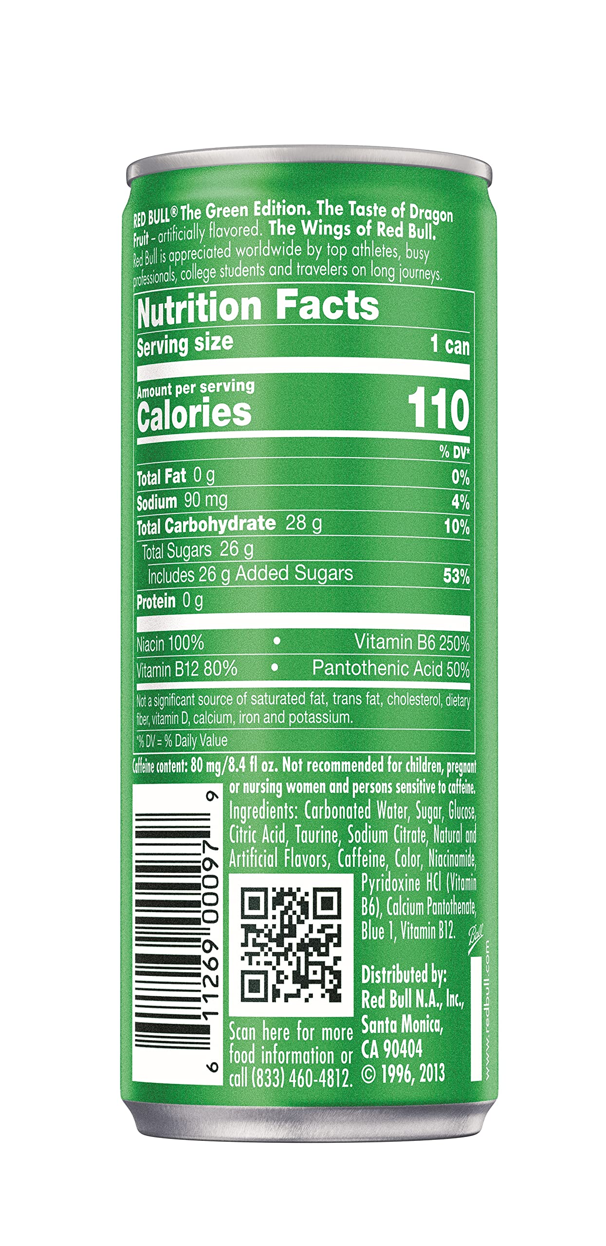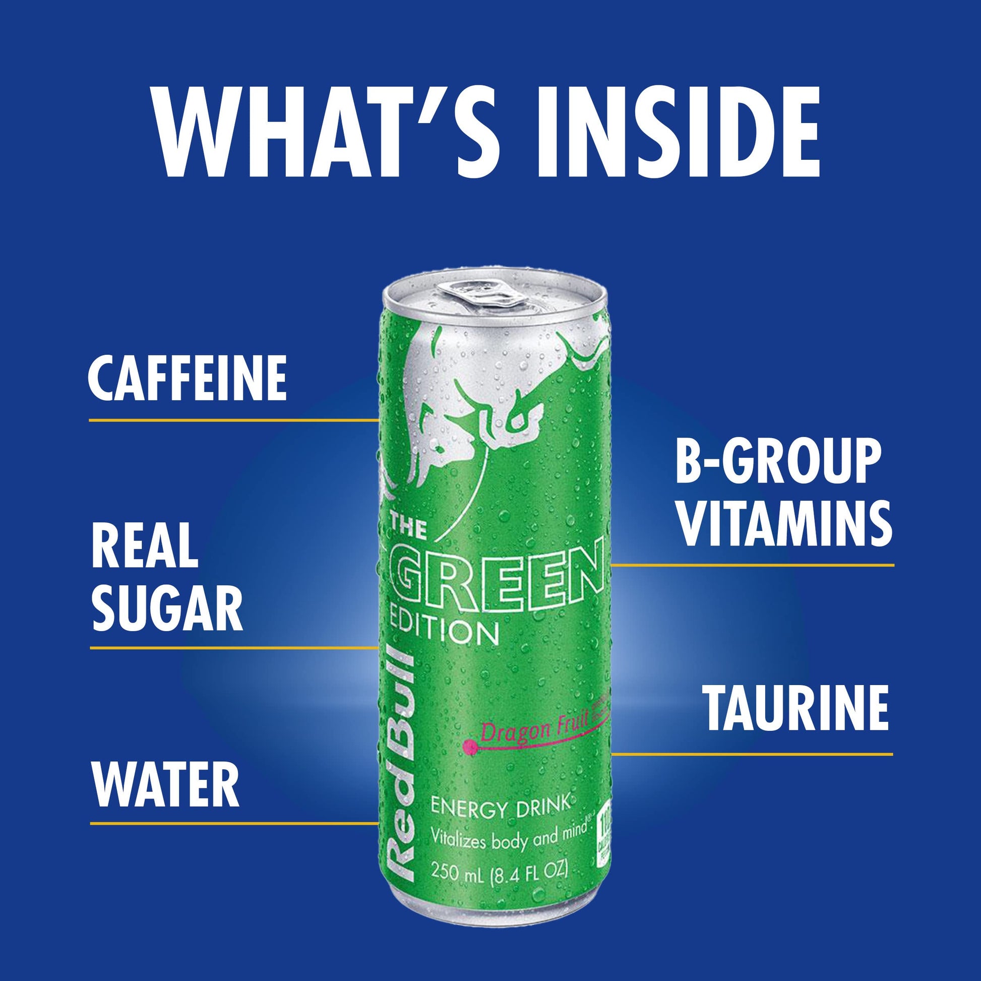 Details: Red Bull Green Edition Dragon Fruit Energy Drink gives you Wiiings whenever you need them. Red Bull Green Edition is a lightly carbonated energy drink with a blend of caffeine, taurine, B vitamins, real sugar and water with the exotic taste of dragon fruit.* With 110 calories per 8.4 fl oz can, Red Bull is great for any occasion. While aiming for great heights during your workday, in your workouts or when gaming, why not crack open a refreshing can of Red Bull? Drink Red Bull straight from the can or enjoy in a glass over ice. This 24-pack of Red Bull will keep you stocked for any occasion, whether itβs hanging with friends, watching the game or going on a road trip. Be ready for the big moments with a can of Red Bull. Store these cans of Red Bull at room temperature or toss them in the fridge. Red Bull gives you Wiiings.