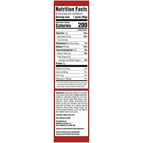 Details: RITZ Cheese Sandwich Crackers are the classic go-anywhere snack that kids and adults have loved for years, layering smooth, creamy cheese between two crisp RITZ snack crackers. The mouthwatering filling is made with real cheese and meets kosher dairy requirements to satisfy various dietary preferences. Individually wrapped for freshness and portability, these cracker packs make a great snack anytime you're craving crackers and cheese. Each package contains six boxes of 16 1.35-ounce snack packs, with six cracker sandwiches per pack.