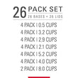 - Set contains four 0. 5-cup, four 3. 2-cup, four 2. 1-cup, four 2. 9-cup, four 5. 2-cup, four 4-cup, and two 8-cup containers, plus lids, for a total of 52 pieces