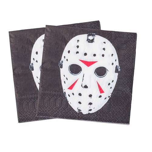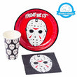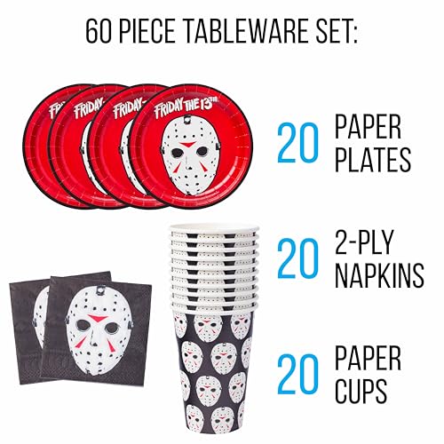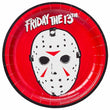 - FRIDAY THE 13TH: Party packs include plates designed with the famous Jason mask from Friday the 13th on a red background. Napkins and cups include a multi-patterned print of this terrifying mask.