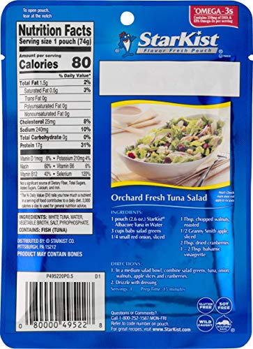 Details: Whether you’re squeezing in lunch between meetings during a busy workday or want a quick, protein-packed and nutrient dense snack between soccer practice, school and other daily errands, StarKist Albacore White Tuna in Water is the perfect choice! These 2.6 oz pouches contain wild caught, delicious tuna with a mild flavor. The 100% all-natural albacore tuna pouches are ideal for both quick snacks and as part of a larger meal. It’s soy free and gluten free and works well with Keto, Paleo, Mediterranean and Weight Watchers diet plans! Our flavor fresh tuna to-go pouch preserves the freshness of your favorite meal or snack, so it’s always delicious and ready when you are. There’s no can opener required or draining necessary – just tear, eat and go! This packaged tuna is an excellent, natural source of protein, and Omega 3s. It has 17g of protein and 80 calories per pouch, plus, it’s a great, quick and easy way to add seafood to your diet! Tuna is a wholesome way to add variety to your meals. Easy to store, you can stock up with this 12-Pack, and keep these tuna pouches in your office, pantry at home and even in your diaper bag or car! An industry innovator, StarKist was the first brand to introduce StarKist single-serve pouch products, which include Tuna, Salmon and Chicken Creations, and StarKist Selects E.V.O.O. As America’s favorite tuna*, StarKist represents a tradition of quality, consumer trust and a commitment to sustainability. *Nielsen Custom Scantrak Data xAOC Dollar Share Latest 52 Weeks