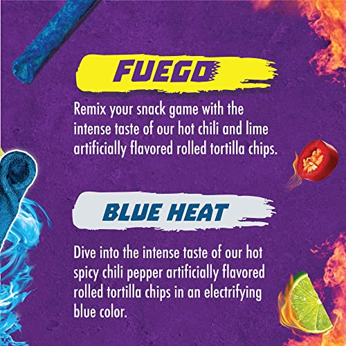- A Frenzy of Flavor: Remix your snack game with the intense taste of two of our most popular flavors, Fuego and Blue Heat! Bite into our spicy hot chili pepper and lime or the hot spicy chili pepper artificially flavored rolled tortilla chips.