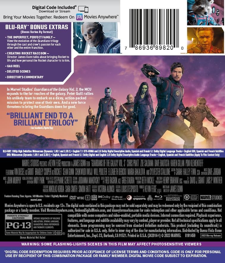 Details: In Marvel Studios "Guardians of the Galaxy Vol. 3" our beloved band of misfits are looking a bit different these days. After acquiring Knowhere from the Collector, we find the Guardians working to repair the extreme damage done by Thanos-determined to make Knowhere a safe haven, not only for themselves, but for all refugees displaced by the harsh universe. But it isn't long before their lives are upended by the echoes of Rocket's turbulent past. Peter Quill, still reeling from the loss of Gamora, must rally his team around him on a dangerous mission to save Rocket's life-a mission that, if not completed successfully, could quite possibly lead to the end of the Guardians as we know them