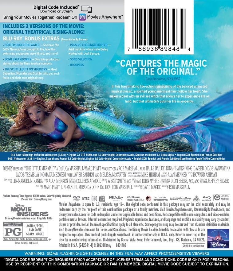 Details: Remarkable live-action/CGI redo of the '89 Disney musical classic stars Halle Bailey as the mermaid princess Ariel, whose curiosity about the surface world and attraction to the human prince Eric (Jon Hauer-King) leads her to clash with her overprotective ocean king father (Javier Bardem)-and leaves her ripe for exploitation by the calculating sea witch Ursula (Melissa McCarthy). All-ages charmer also features the voices of Daveed Diggs, Awkwafina, Jacob Tremblay. 135 min. Widescreen; Soundtrack: English.