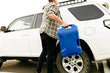 - 6 gallon, blue water container, ideal for safely transporting & storing water, rugged, heavy wall construction for durability, has flexible spout, molded in handle, 13