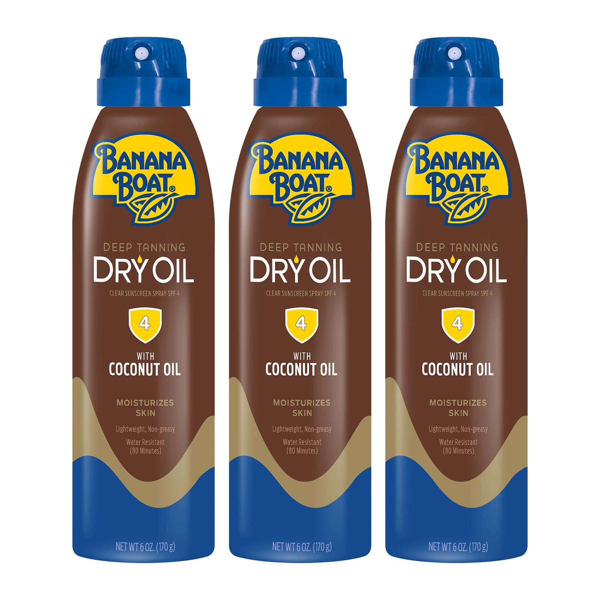 Details: Banana Boat Deep Tanning Dry Oil Clear Spray Sunscreen with SPF 4 has that great dry oil feel with argan oil. The non-greasy and lightweight feel of Banana Boat Deep Tanning Dry Oil Clear Spray Sunscreen leaves your skin feeling silky-smooth. The argan oil helps this unique lightweight dry oil formula go beyond sun protection. Banana Boat Deep Tanning Dry Oil Clear Spray Sunscreen SPF 4 formula promotes a sun-kissed glow. It's a one-touch spray, for quick and easy coverage. Banana Boat Deep Tanning Dry Oil Clear Spray comes in a 6oz UltraMist spray can, twist 'n lock spray, with no cap! Banana Boat Deep Tanning Dry Oil Clear Spray Sunscreen is water-resistant for up to 80 minutes.