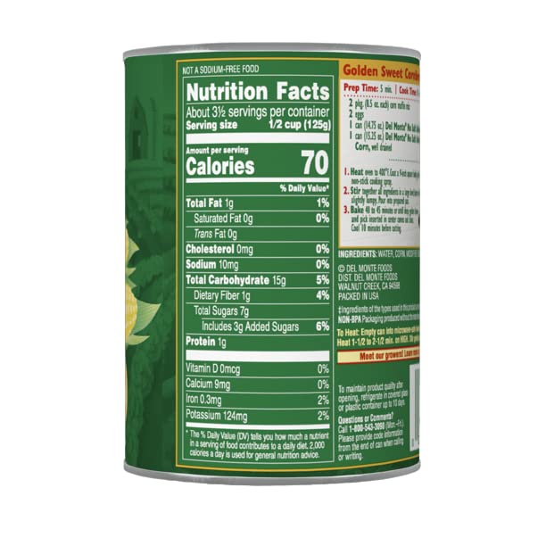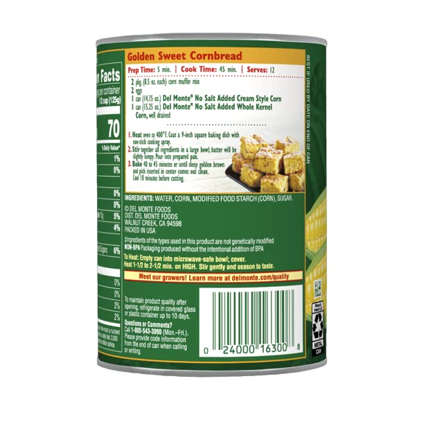 Details: 2 Cans - 14.5 Ounces Each...BRAND NEW Factory Sealed...NO SALT ADDED...Del Monte CREAM STYLE SWEET CORN - Made with FRESH CUT GOLDEN SWEET CORN...Ingredients: Water, Corn, Modified Food Starch (Corn), Sugar.