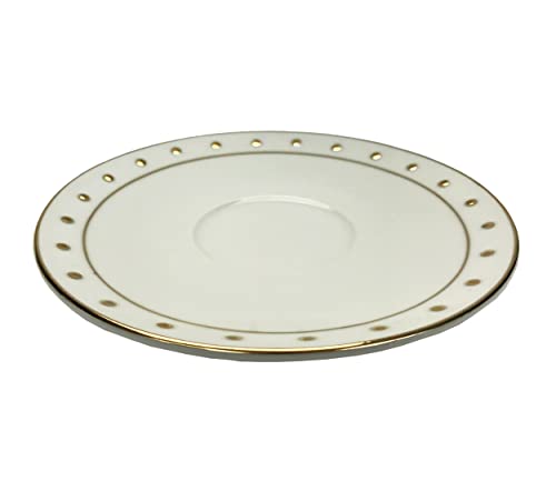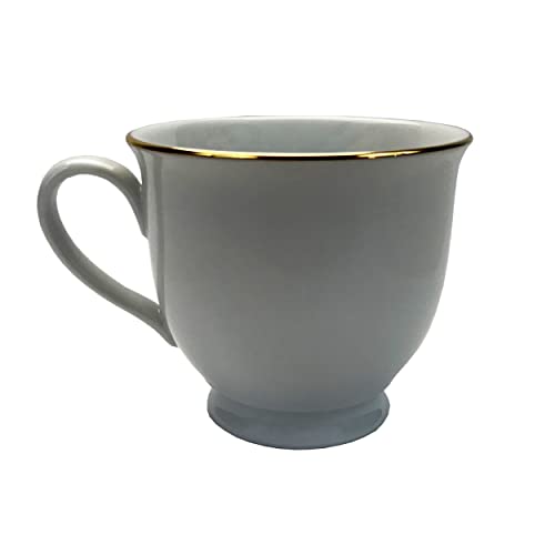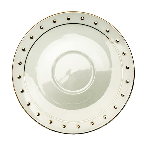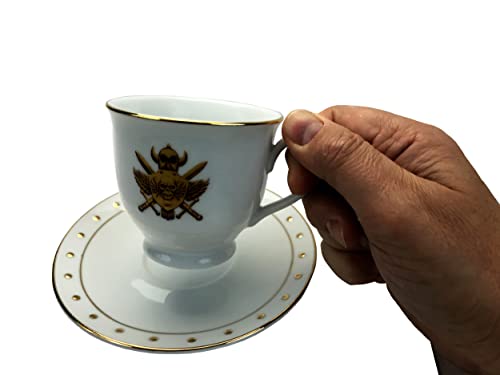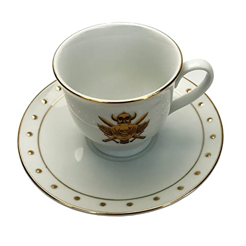 Details: Fine white porcelain with 18k gold accents. Inspired by an actual Imperial dinner service used by the Romanov Dynasty, this fine tableware is fit for Enternian Royalty and perfectly blends fantasy and reality. Add a touch of class to your next regal banquet! Perfect for tea, coffee or simply display, each set is presented in a gift box. Saucer measures 6.5 inches. Cup holds 8 ounces.