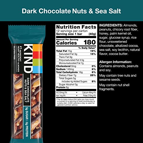 Details: KIND Dark Chocolate Nuts & Sea Salt bars are satisfying gluten free bars packed with nuts and the taste of dark chocolate that you can take anywhere. These KIND nut bars lead with heart healthy almonds as the #1 ingredient. This healthy snack bar combines quality ingredients like almonds, dark chocolate, and sea salt to deliver a delicious taste with a little crunch. These snack bars come packed as individually wrapped snacks for a convenient option that makes eating healthy easier. It's the perfect nutrient-dense pick-me-up when life gets in the way. KIND bars Dark Chocolate Nuts & Sea Salt contain 5 grams of sugar, 6 grams of protein, and are a good source of fiber*. This KIND nut bar is also gluten free, has a low glycemic index, and is made without genetically engineered ingredients. *Contains 14g of fat per bar