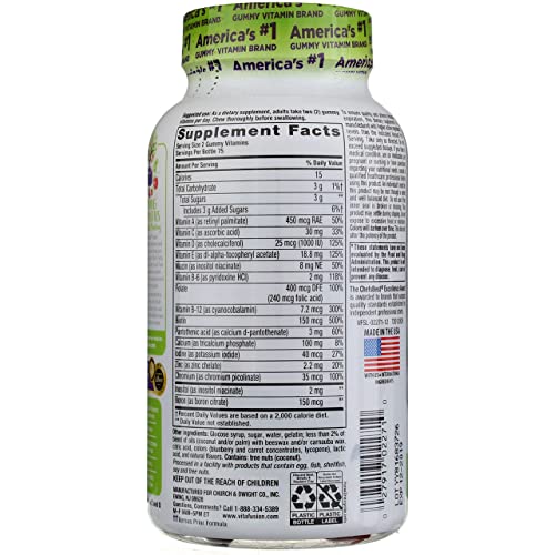 Details: vitafusion Adult Gummy Multivitamins for Women are daily dietary supplements formulated to address the health needs of women. Each delicious two-gummy serving combines essential vitamins and minerals with natural fruit flavors to provide a great tasting and convenient alternative to traditional, hard-to-swallow vitamin pills. At vitafusion, it is a belief that taste and nutrition can be fused together, ensuring that taking your women's daily multivitamin is an easy and delicious part of your day.